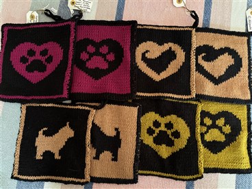 Handstickade grytlappar i bomull med norwichterrier eller hundtassmotiv