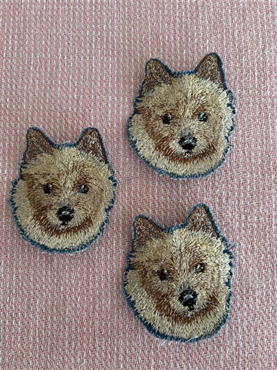 Märken med norwichterrierbrodyr att sy (eller kanske klistra) fast