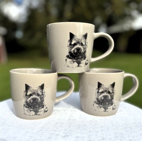 Grå stengodsmugg med norwichterriermotiv tecknat av Ewa Dobrzynska